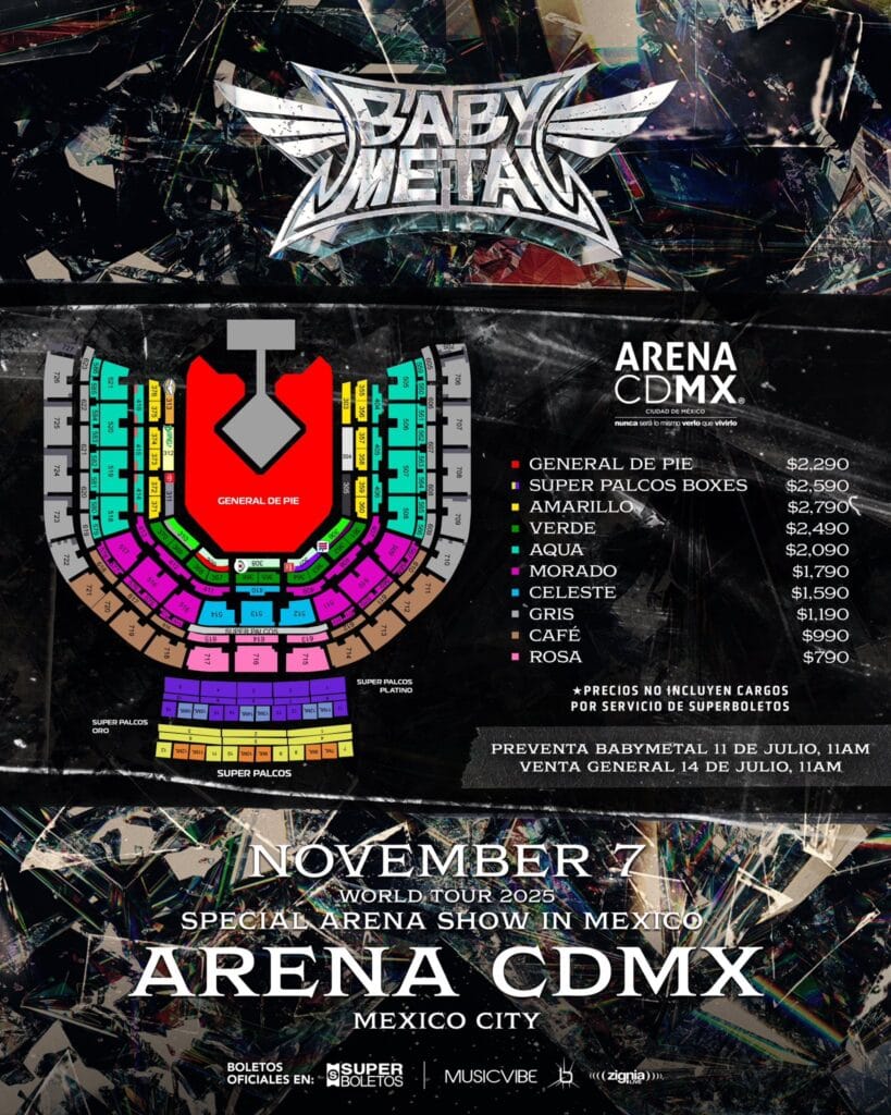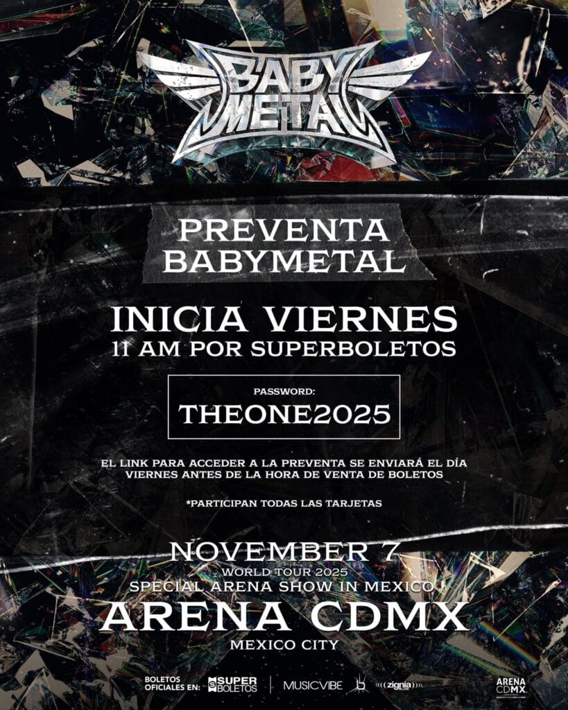 La preventa exclusiva para fans está programada del 11 al 13 de julio de 2025 a través de un link exclusivo compartido por la banda en donde te pedirán un código para acceder a la compra anticipada, mientras que la venta general comenzará el lunes 14 de julio a través de superboletos.com, con precios que van desde $799.00 hasta $2,290.00 (No incluyen cargos por servicio), ofreciendo opciones para todos los bolsillos. Este concierto no solo promete un espectáculo visual y sonoro de primer nivel, con su característico kawaii-metal, sino también la presentación de temas de su reciente álbum ‘METAL FORTH’ que sera estrenado el 8 de agosto .