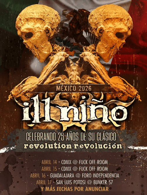 El legado del nu metal latino retomará fuerza en los escenarios nacionales. La gira de Ill Niño en México 2026 ha sido confirmada oficialmente, centrando su concepto en la celebración de los 25 años de Revolution Revolución (2001). Este álbum, que definió una era mediante la mezcla de percusiones tribales y agresividad, será interpretado íntegramente de principio a fin, además de un recorrido por sus éxitos más emblemáticos.