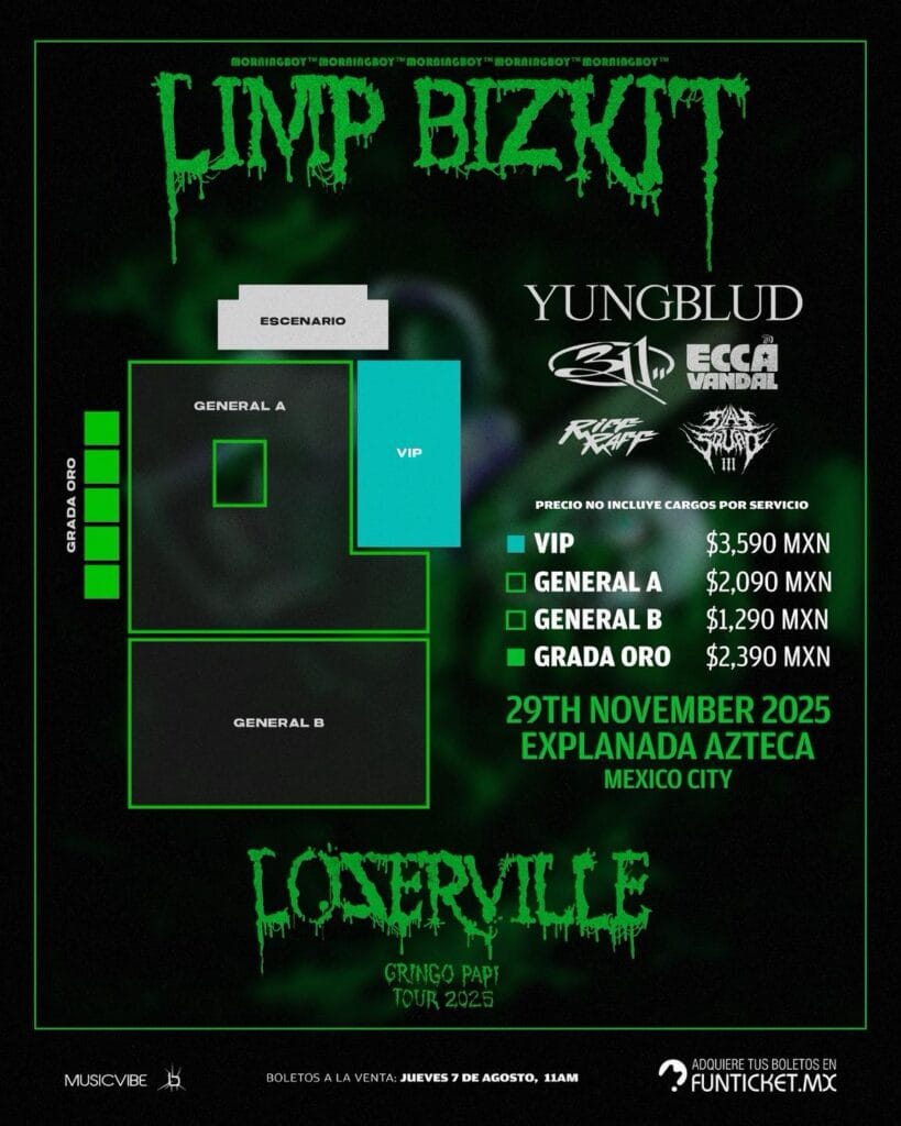 La legendaria banda de nu metal, Limp Bizkit, está lista para hacer temblar la Ciudad de México con un concierto inolvidable el 29 de noviembre de 2025 en la Explanada del Estadio Banorte, como parte de su explosiva gira «Lozerville Gringo Papi Tour 2025″. Liderados por el carismático Fred Durst, junto a Wes Borland, John Otto, Sam Rivers y DJ Lethal, prometen una noche cargada de energía, nostalgia y los himnos que definieron una era, como “Rollin’”, “Nookie”, “Break Stuff” y su icónico cover de “Faith”.