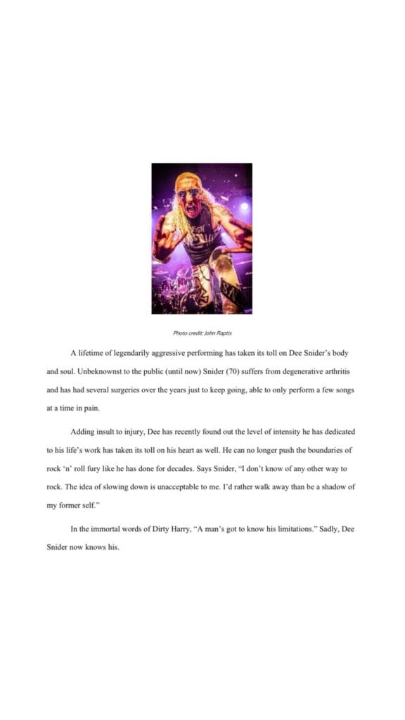 Ante esta situación, Twisted Sister cancela su gira de 50 aniversario 2026 bajo la premisa de no entregar un show a medias. Snider fue tajante al declarar que prefiere retirarse antes que ser «una sombra de sí mismo», dejando claro que la integridad del legado de la banda está por encima del negocio.
