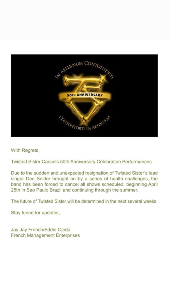 Durante los últimos meses, los rumores sobre que Twisted Sister cancela su gira de aniversario ya circulaban en la web. Se especuló intensamente que Sebastian Bach (ex-Skid Row) podría tomar el lugar de Snider para cumplir con los contratos. Sin embargo, las negociaciones no prosperaron y la banda decidió que sin su frontman original, el concepto del 50 aniversario perdía todo sentido.